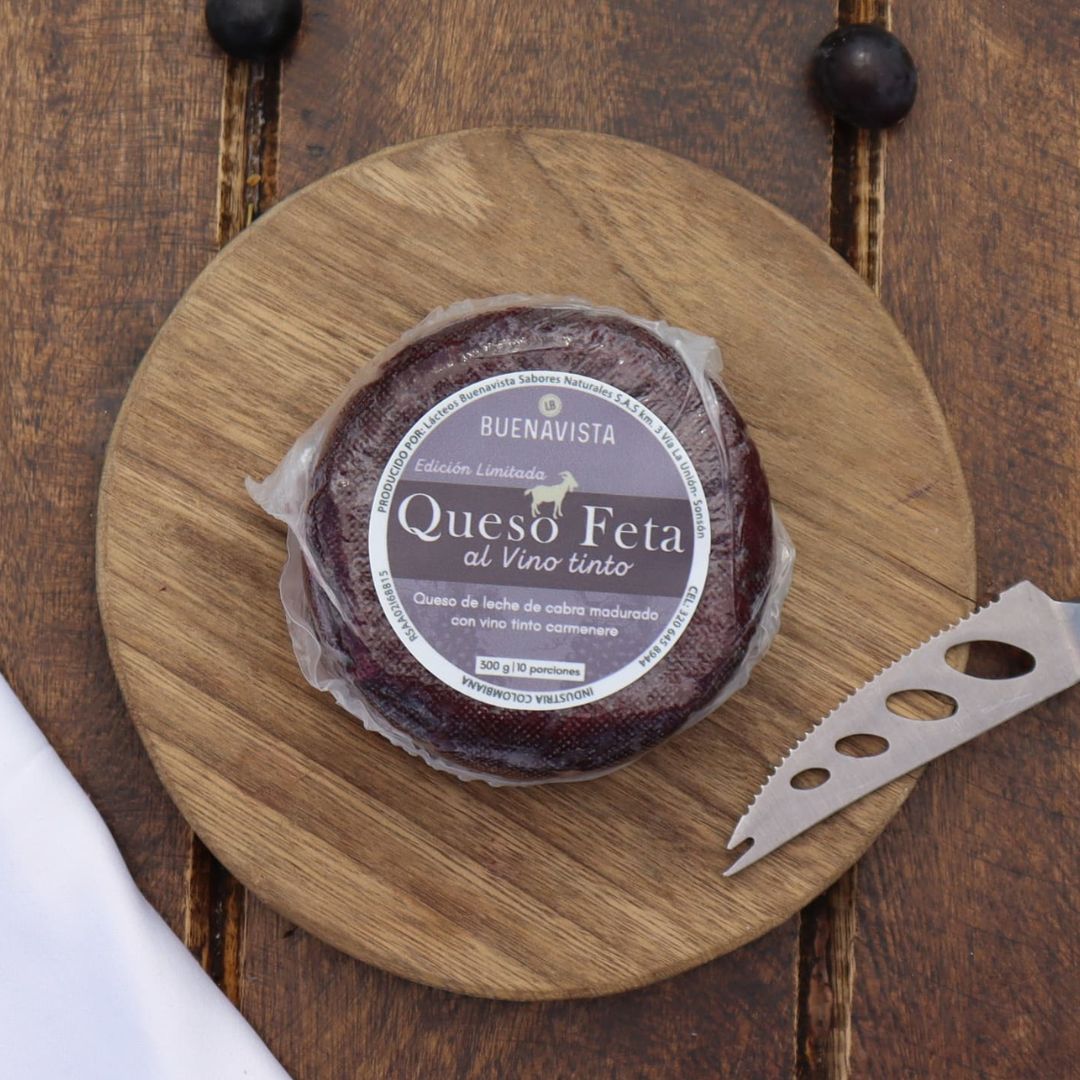 Queso feta artesanal elaborado con leche de cabra pasteurizada, madurado durante 12 meses. De textura granulada y cremosa, presenta un sabor intenso, ligeramente ácido y salado, con un perfil afrutado notable gracias a su afinado en vino tinto. Esta técnica le aporta un aroma profundo y un exterior de color púrpura característico.