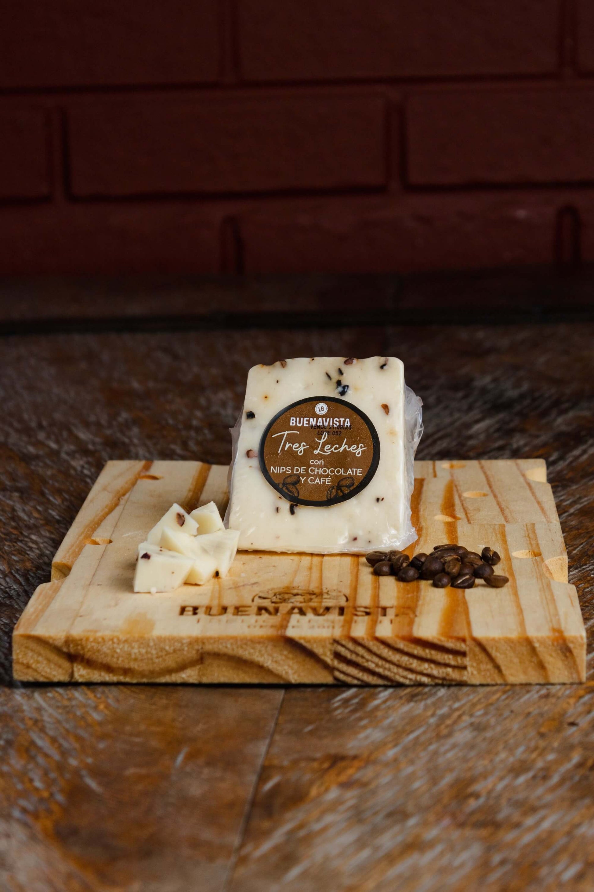 Queso artesanal elaborado con una mezcla de leche de cabra, vaca y oveja, madurado durante 40 meses. De textura granulosa y color blanco perlado, presenta un sabor profundo y complejo, enriquecido con nibs de chocolate y café que aportan notas tostadas, amargas y ligeramente dulces, creando un contraste armónico con su perfil láctico e intenso.