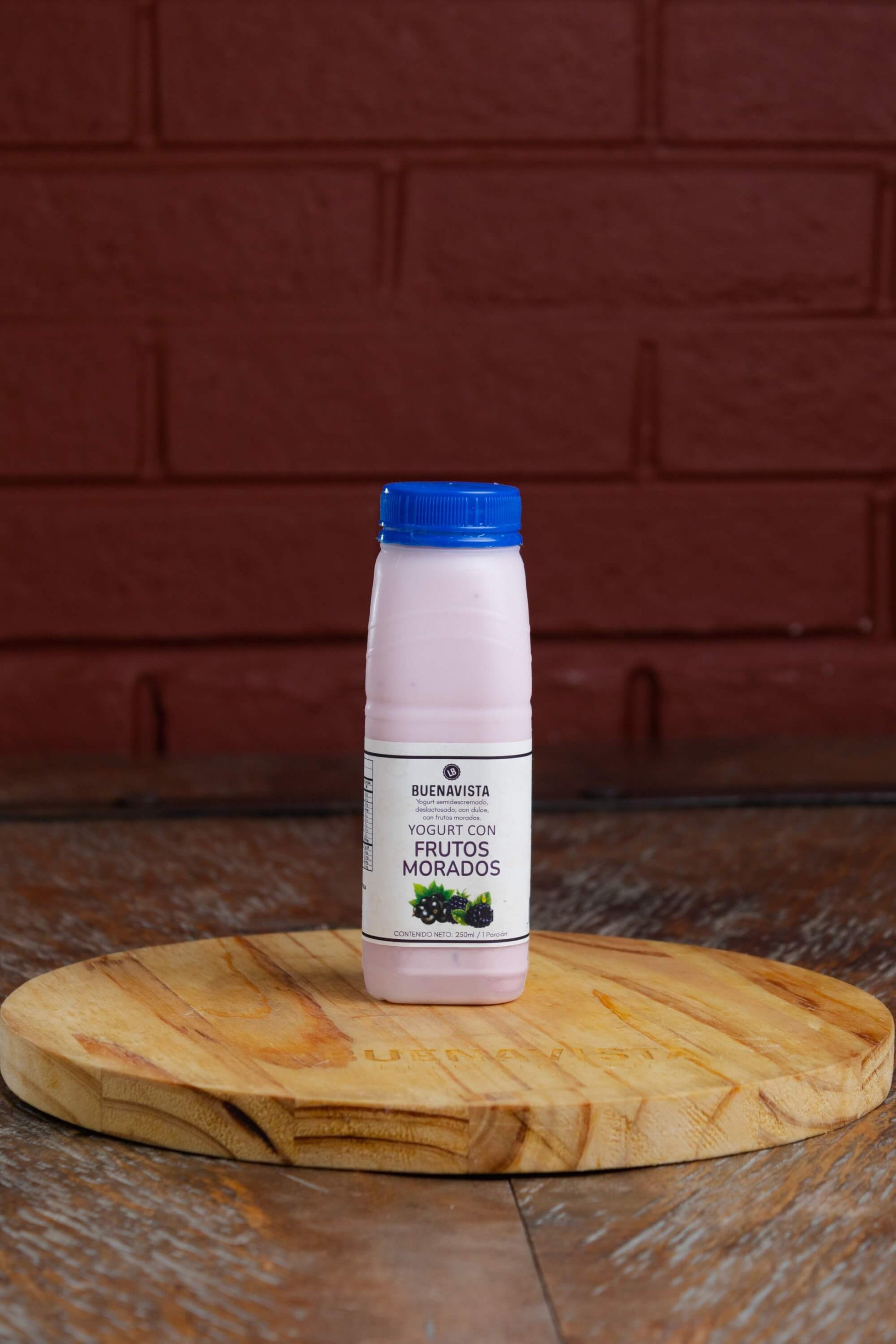 Yogurt artesanal de frutos morados, elaborado con leche de vaca semidescremada y deslactosada, enriquecido con probióticos y prebióticos. Contiene mezcla de frutas naturales como mora, arándano y agraz, que aportan una textura cremosa y un perfil frutal profundo, con notas dulces y ligeramente ácidas.